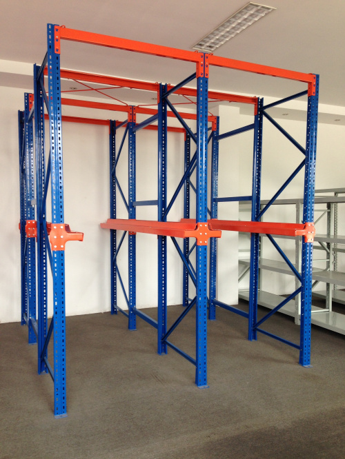 仓储式货架、贯通式货架,都是采用格构式立柱边续方式连接起来的多门式、托盘单元化货品沿深度方向一个紧接一个存储在悬臂梁上的货架结构形式。这种模具架结构形式可使叉车作业通道和货品存储空间共用,大大提高了仓库的空间、场地面积利用率,但同一作业通道内的货品不能做到先进先出,适合于大批量、少品种或作业通道内的货品一起流向同一客户的货品存储,如饮料、乳制品、烟草、低温冷冻仓储、标准规格的家电、化工、制衣等行业。据统计,驶入式货架可以达到最大的存储密度,空间有效利用率最多可提高到90%,场地面积利用率可达60%以上!